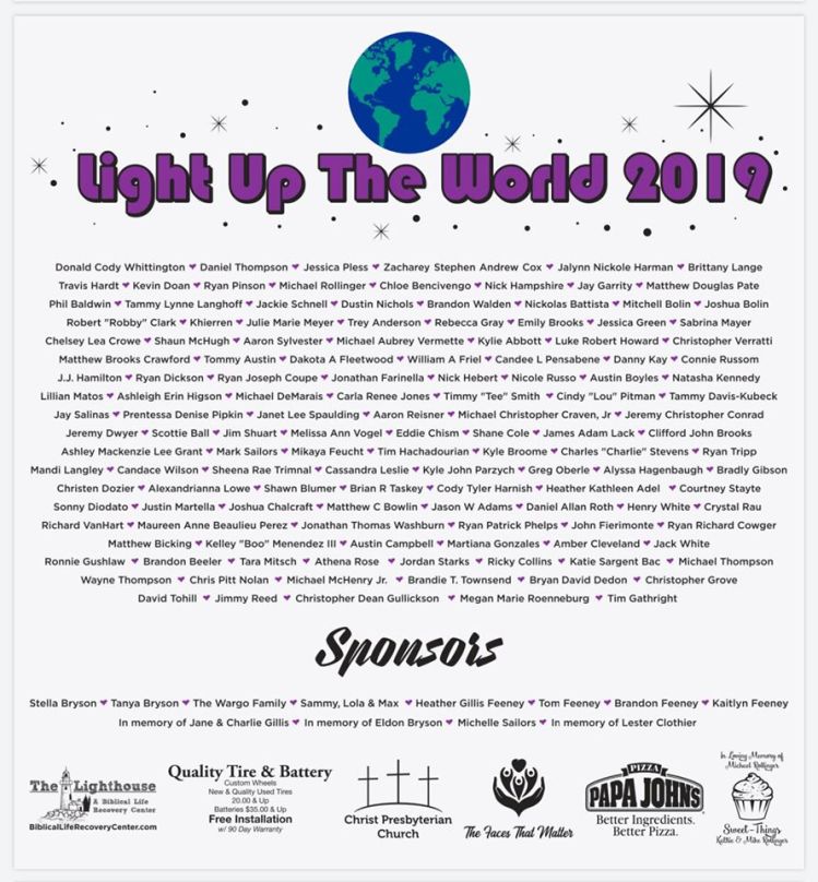 Every year, our group honors our angels during the time of International Overdose Awareness in the month of August. We light a candle for our angels gone too soon, we speak their name. They are never forgotten. LUTW started with a simple idea on how to remember our loved ones and friends who have passed away due to SUD, Substance Use Disorder. We needed to find a way so that they would not be forgotten. In 2016 over 2,600 people attended and helped us shine bright only to exceed that number the past 2 years.